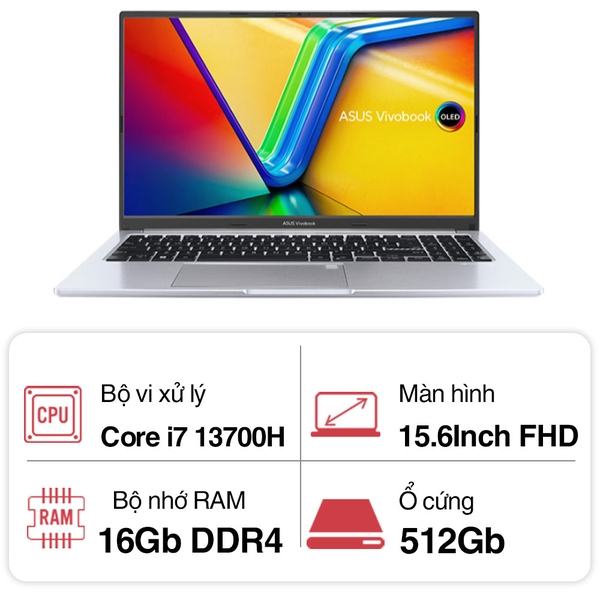 Laptop Asus Vivobook 15 OLED A1505VA-L1491W (Core i7 13700H/ 16GB/ 512GB SSD/ Intel Iris Xe Graphics/ 15.6inch FHD OLED/ Windows 11 Home/ Silver)