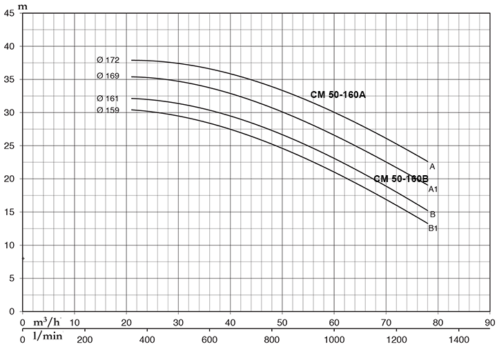 - Pentax CM 50-160A có dải cột áp từ 36,7m - 22,6m tương ứng với dải lưu lượng là 0 - 78m³/h.